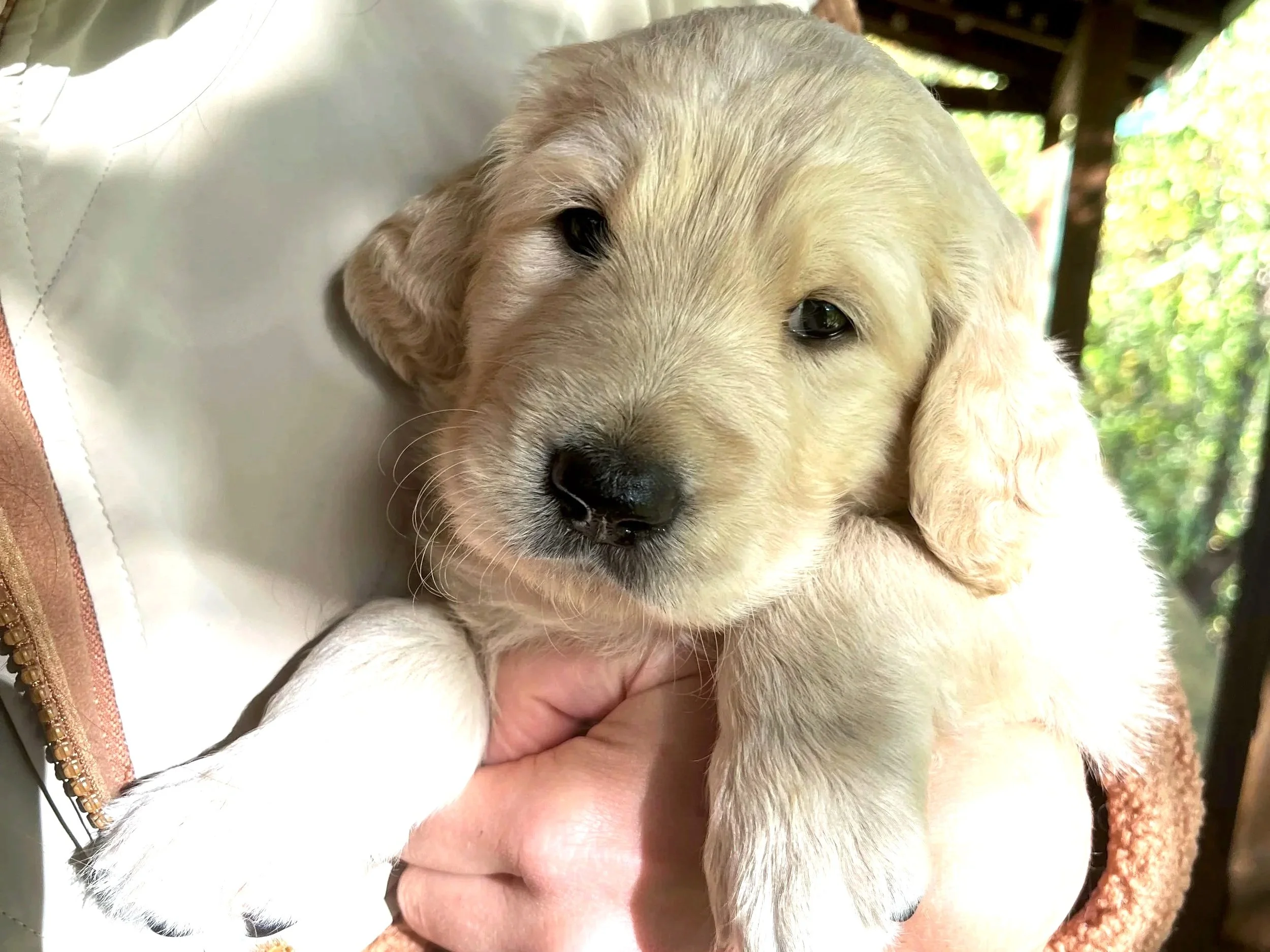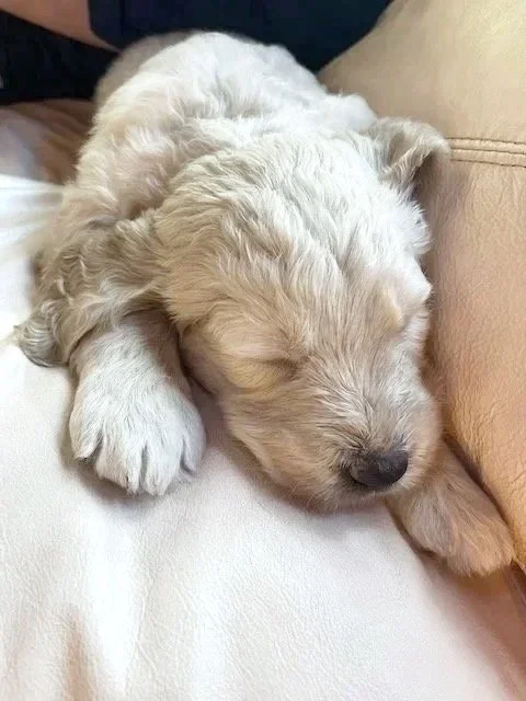 Coming in early May! These cuties will be approximately 64% Golden Retriever and 36% Poodle Mix gifting them with hybrid vigor, a gentle temperament, and a lower shedding coat than a traditional Golden Retriever. We opted for a higher mix of Golden Retriever than Poodle to preserve the gentle and friendly temperament that families have come to expect from Golden Retrievers in their Golden Doodle puppy. They are usually a mix of curly and wavy with both furnishings and open faces. They will likely all be light cream in color.