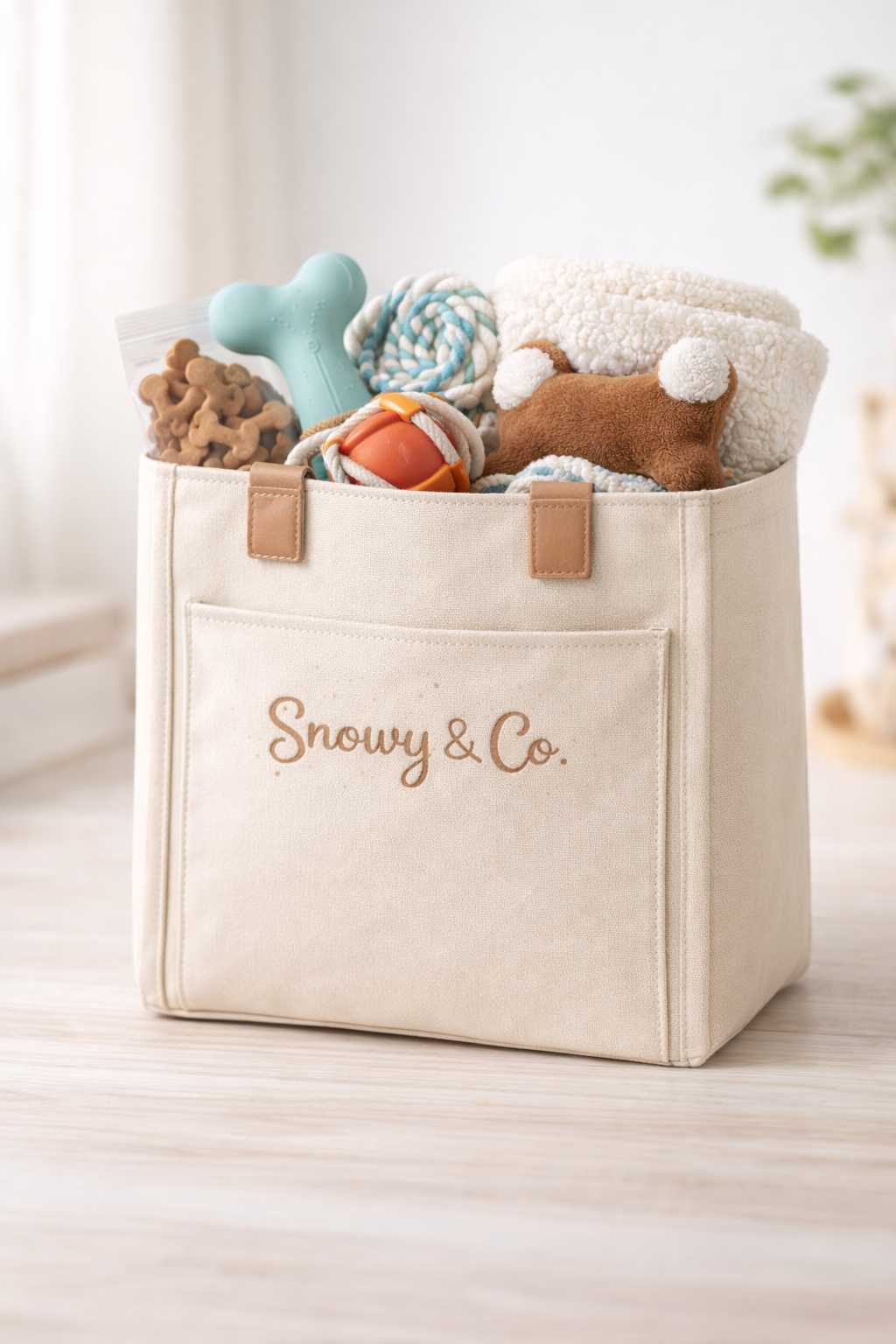 A personal bag full of toys and treats and a comforting snuggly with heartbeat for your new puppy, also a small blanket with Mother and litter mates scent. The bag has Snowy & Co.’s logo printed on one side.